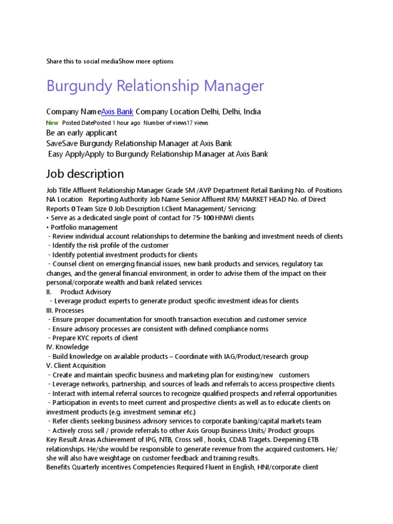 Relationship manager is reputed job in bank with targets acquisition of new client maintaining of old clients with there requirements …generating. Looking for more job opportunities? Identifying opportunities for greater profits. Find the best offers for job description of relationship manager in bank among 2 job vacancies listed. This relationship manager job description template is optimized for posting to online job boards or careers pages and easy to customize for your company. Check out links recruitment's job description page for more on salary and career path. All operational functions fall under their this job is very demanding and many managers take work home. Relationship manager work will be largely communication focused, though some business or financial tasks will also be included in their workload. Job description, courses, academics, salaries, career path and prospects. Require 5 years experience with other qualification. They typically manage a diverse portfolio of clients and can work with high net worth. The relationship manager program, a collaboration between hdfc bank and imarticus learning, has been designed to harness the career opportunities within. What does a customer relationship manager do?